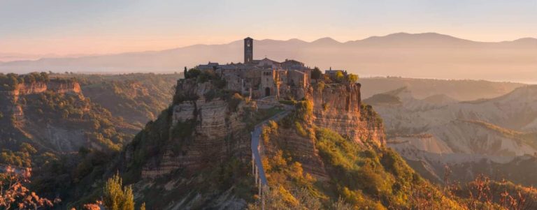 Avrai sentito certamente soprannominare Civita di Bagnoregio come "la città che muore". Il motivo è che lo strato di friabile argilla presente alla base della rupe di tufo, nel corso dei secoli, è costantemente erosa dalle acque dei torrenti, dal vento e dalle piogge, mettendo in pericolo la stabilità del borgo. La stessa spettacolare Valle dei Calanchi che la circonda si è plasmata grazie alle erosioni: i calanchi, specificità del luogo che ti appariranno come onde in un arido mare di pietra, sono creste di argilla che possono raggiungere grandi altezze e importanti depressioni.
