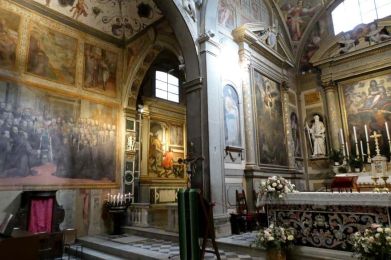 -Nella Cappella di San Giovanni Gualberto, gli affreschi di Alessandro Allori raccontano la vita del santo e la Ricognizione delle reliquie;