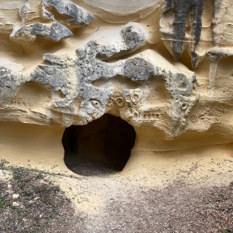 Il nome “Grotte Gialle” deriva proprio dal colore dorato della calcarenite, che in queste zone assume sfumature calde e luminose. Le tombe si distinguono per la loro particolare conformazione a “orecchio di coniglio”, un tratto distintivo delle sepolture etrusche presenti nel territorio di Bibbona. Ogni tomba è costituita da due camere disposte a “V”, separate da una falsa colonna centrale, probabilmente con funzione sia estetica che simbolica.
