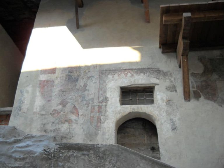 All’interno la Casa degli affreschi suddivisa in due ambienti, presenta decorazioni a tappezzeria, tra le poche sopravvissute degli edifici profani in Valle di Susa, con motivi a rombi e a onde, ma anche girali floreali a corolla rossa e un velario a frange in rosso probabilmente antecedenti al Trecento.
