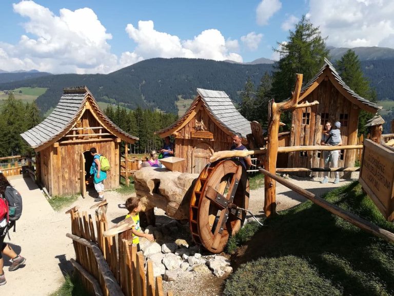 The Village is immersed in the green woods and is made up of nine pretty huts, built strictly in raw wood and huts where it is easy to imagine the gnomes intent on their daily work: their exploration is a small adventure, having to climb ladders and cross small suspended bridges. There is also the castle, from whose turret you can dominate the village and San Candio below, but above all the mill, fed by what might seem to be the miraculous spring that transformed little Haunold forever.