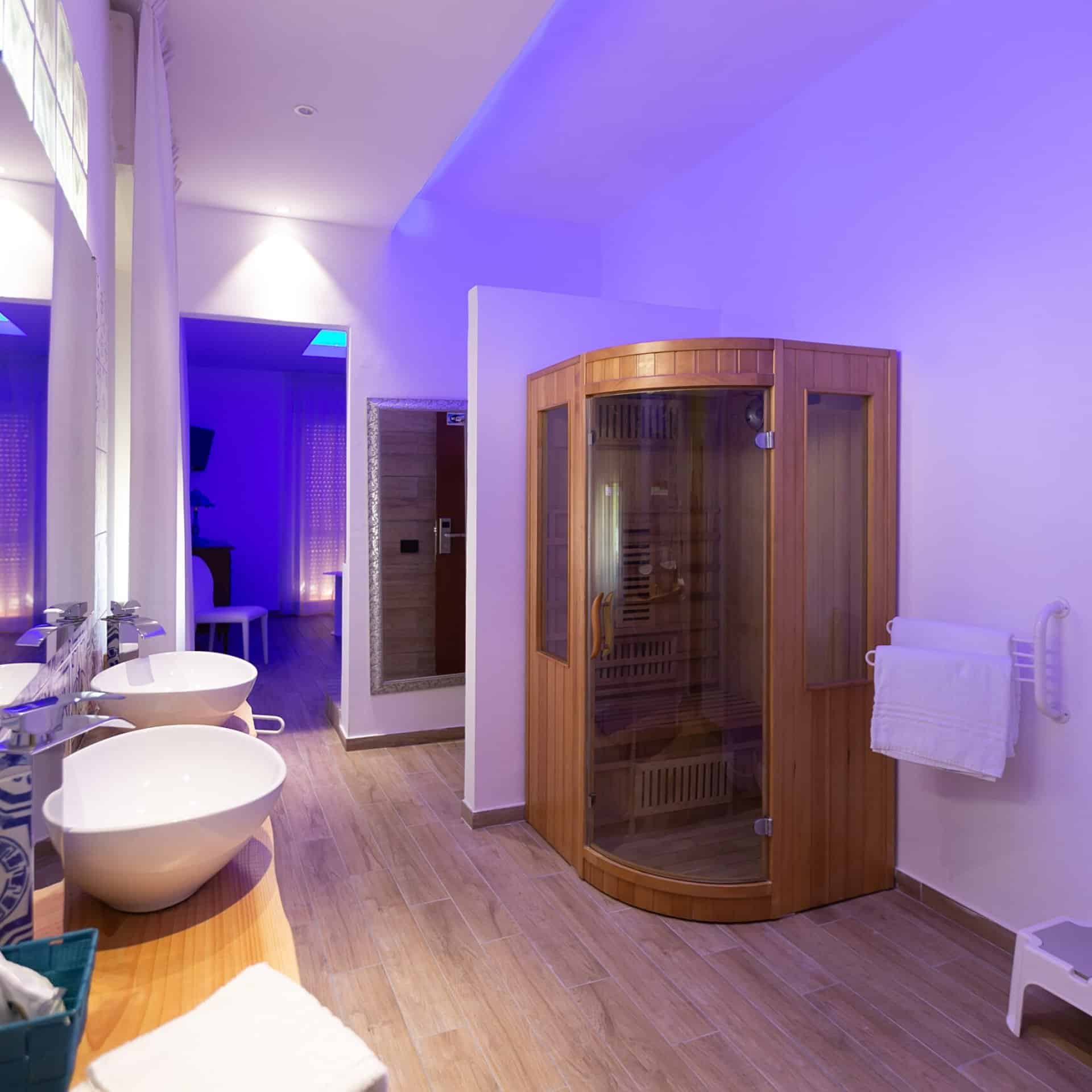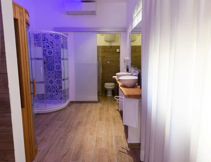 It is equipped with a 130×130 corner whirlpool bath enriched with pick-och tiles decorated by local artists, Finnish sauna and corner shower, as well as double washbasin and concludes in separate toilet facilities area.