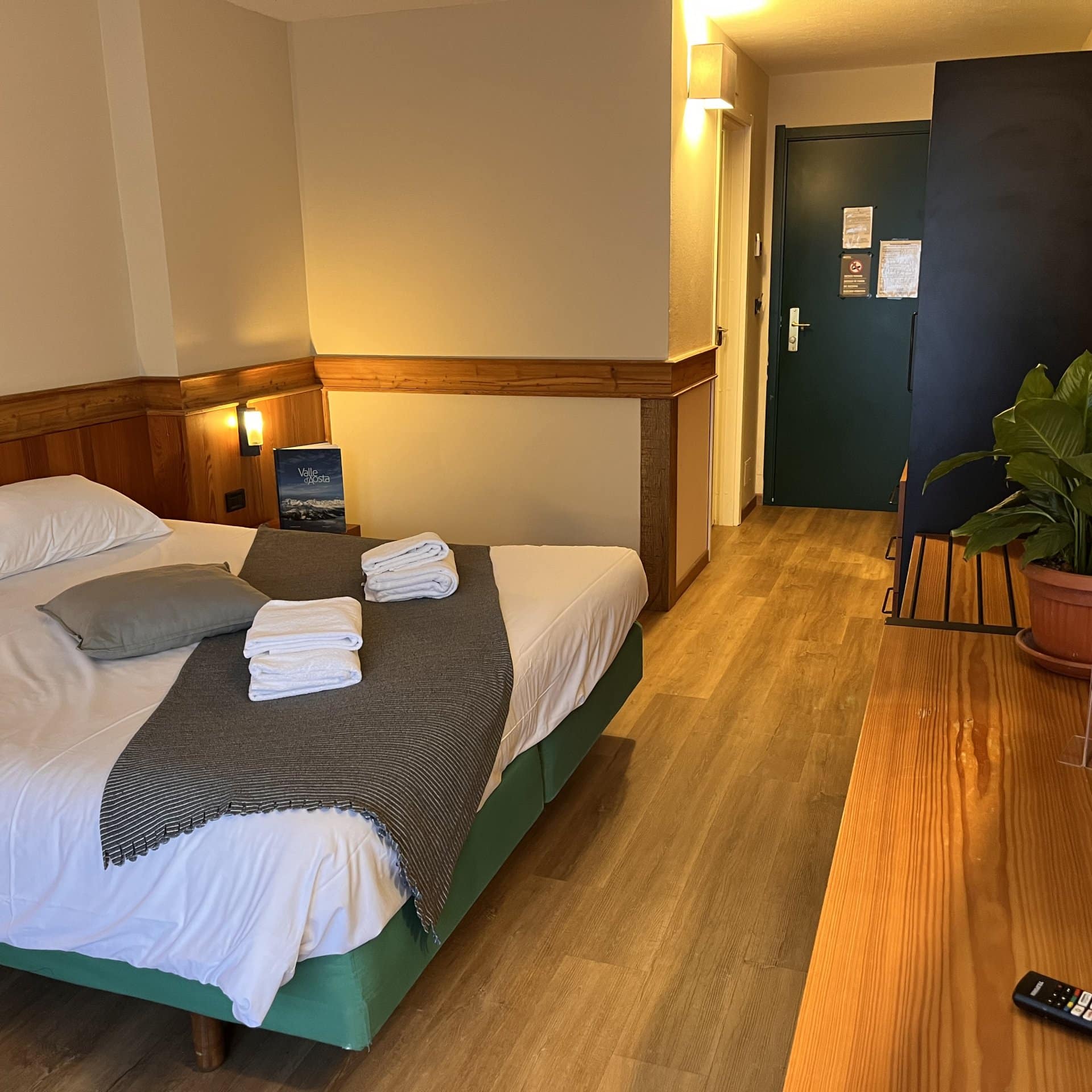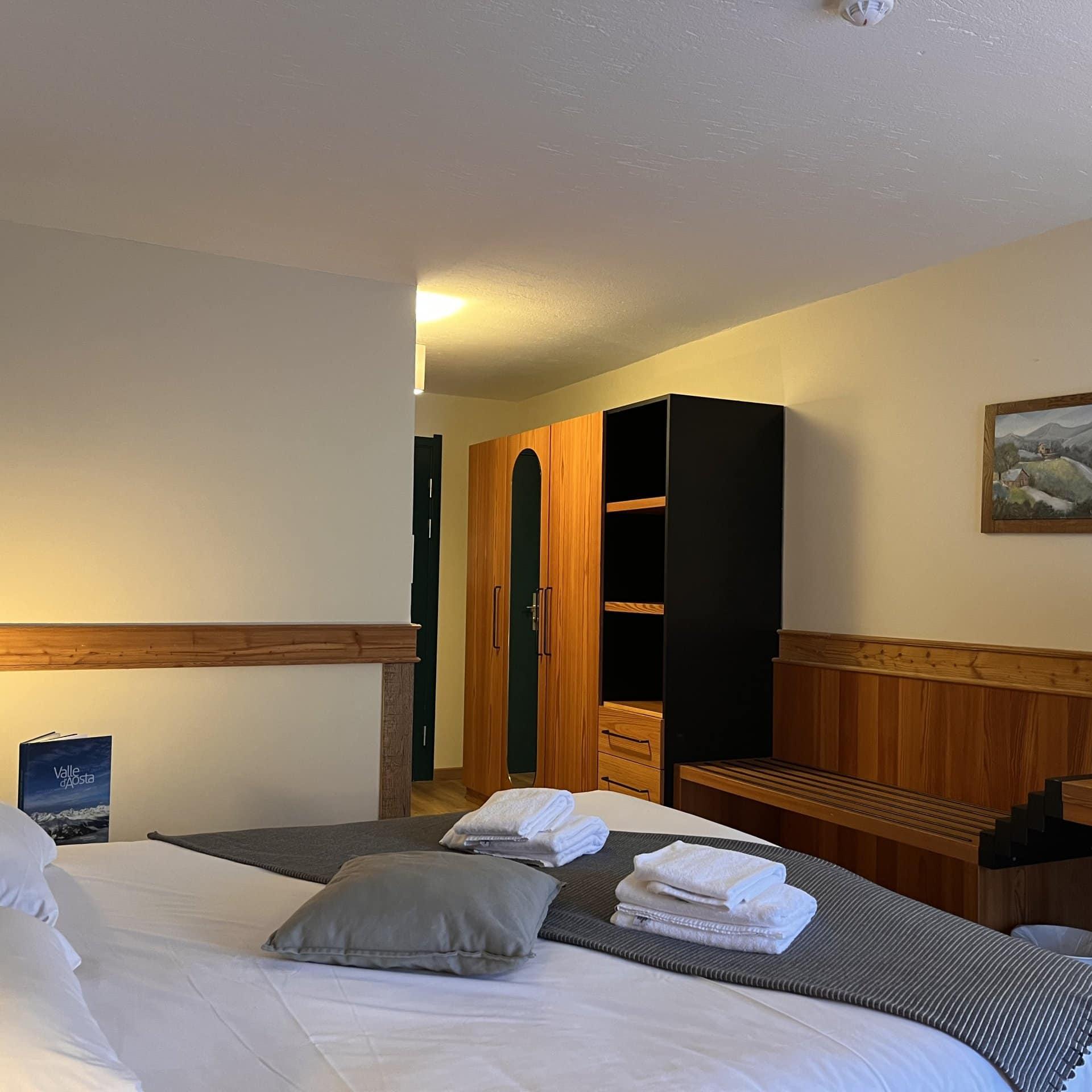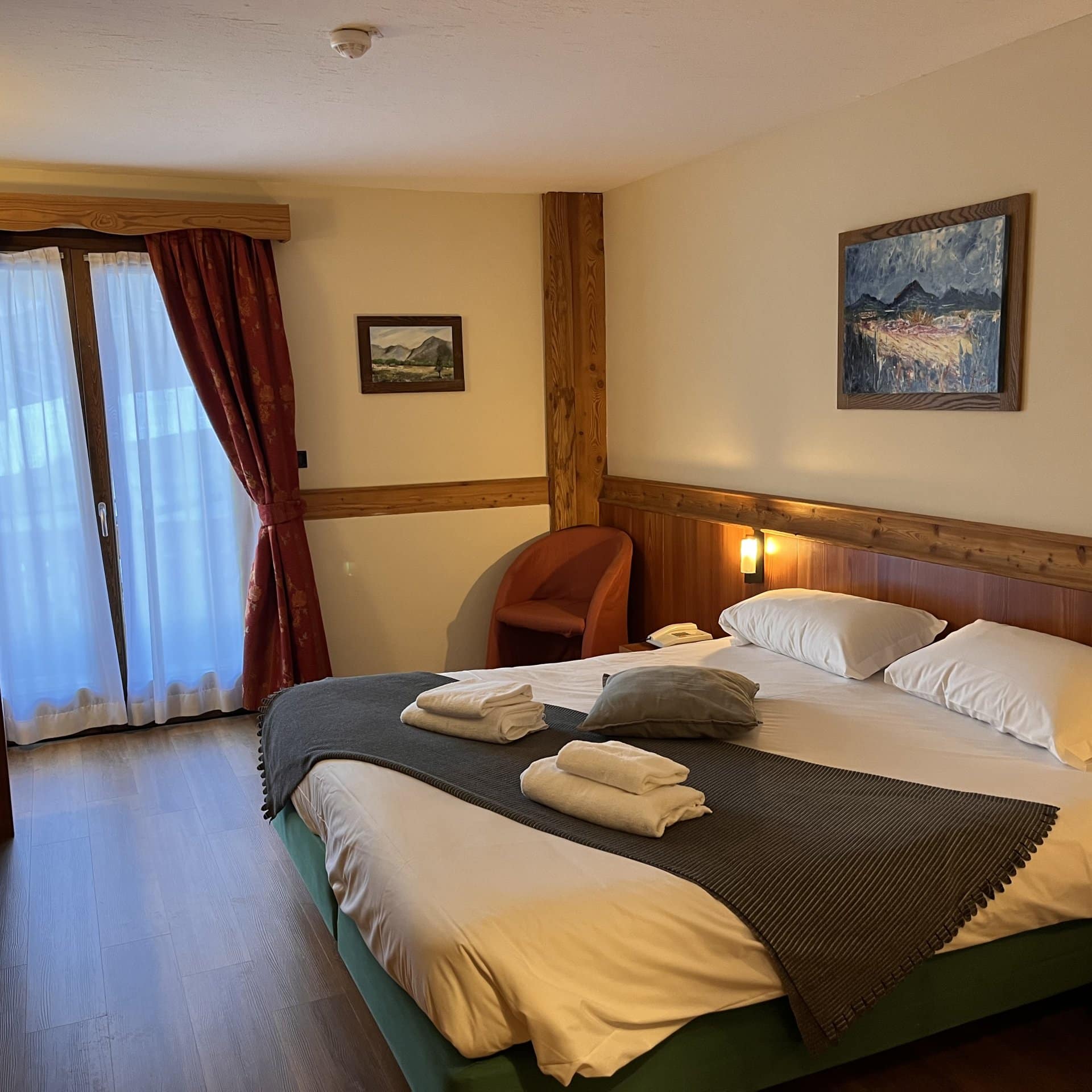 A typical mountain double room, dominated by wood and light. The Alpine-style furnishings are completed by a balcony overlooking the spectacular Monte Rosa or Mount Zerbion.