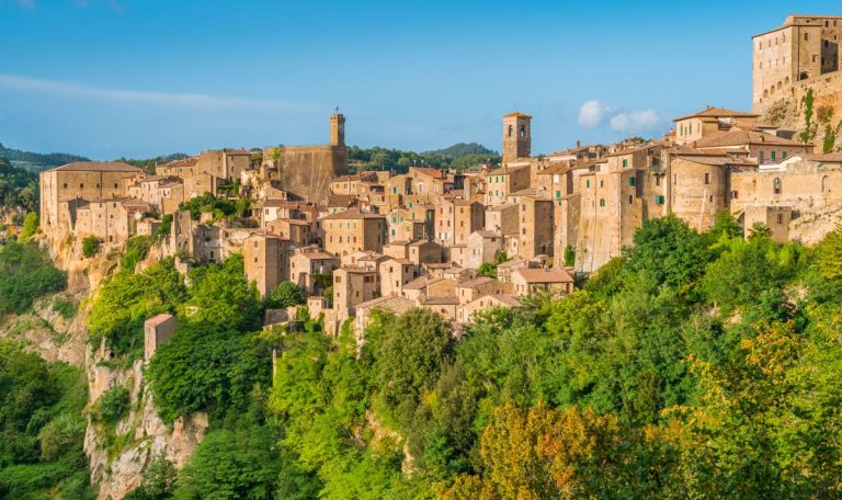Our journey begins with Sorano, a village with unique and enchanting atmospheres, in the province of Grosseto, in the Tuscan Maremma. Also called “The Matera of Tuscany”, the village of Sorano is characterized by its buildings dug into the tufa, its thermal springs and the uncontaminated surrounding nature. It is a place rich in history and culture, a time capsule that holds over thirty different churches, including a convent, a sanctuary and an abbey. In addition to the sacredness of buildings and monuments, the dominant fragrances of the Sorano bouquet are predominantly medieval and Renaissance. Its territory is dotted with historic palaces and ancient castles, such as the Castle of Montorio, the Rocca di Castell’Ottieri and the Castello di Montebuono. Obligatory to visit the “Città del Tufo” Archaeological Park, where you will find fascinating Etruscan necropolis, the Vie Cave and one of the most monumental tombs: Ildebranda.
