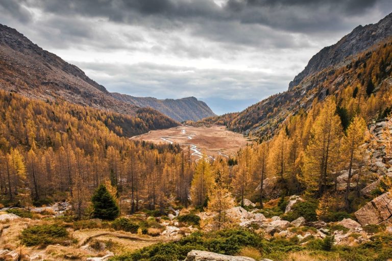 The reddish foliage of the larches also characterizes the Fraele Valley, where it is possible to take an excursion to the artificial lakes of Cancano, turquoise gems that create a spectacular contrast with the surrounding trees.