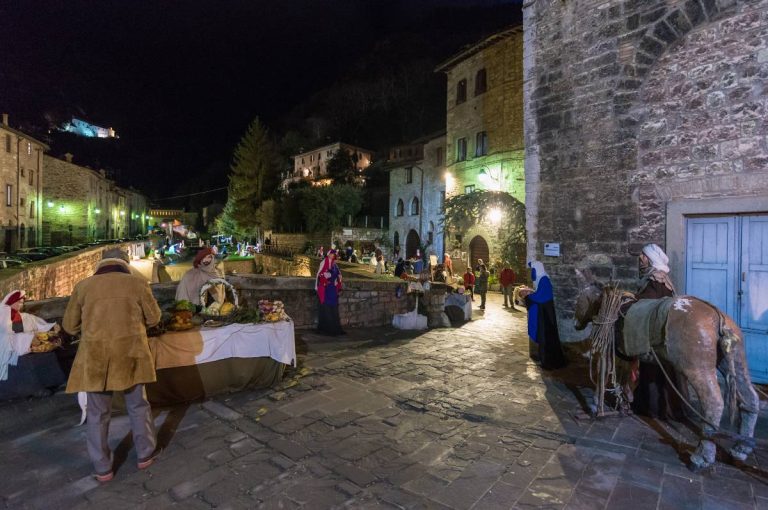 Lying on a comfortable green hill, there is a medieval village of millenary charm: Gubbio. Beautiful to visit in all seasons of the year, at Christmas it turns into a spectacular nativity scene with about 120 human-sized statues while performing the most characteristic trades of the Middle Ages. Each character moves in the direction of the hut where the Holy Family is located in a very natural and suggestive way. But not only that, until the second week of January, the village hosts a wonderful and big Christmas Tree at the foot of Mount Ingino. Rich of lights and particular decorations, the tree has even become part of the Guiness Book of Records, for the joy of adults and children. In this Christmas setting, even the star takes on a special meaning, it is in fact mounted where the Basilica dedicated to the patron saint of Gubbio, Saint Ubaldo, is located as a symbol of protection and respect.