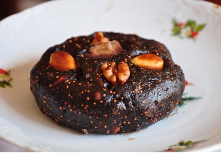We start the preparation a day before, putting the figs and raisins in the wine for a whole day. The next day, we squeeze the figs and raisins and mince them. We cut the walnuts and almonds into small pieces and grate the chocolate. We knead figs, raisins, walnuts, almonds and chocolate with grape jam, cocoa, flour, sugar and cinnamon. We give the dough a shape similar to a loaf and put it in the oven at 180 ° C for 30 minutes.