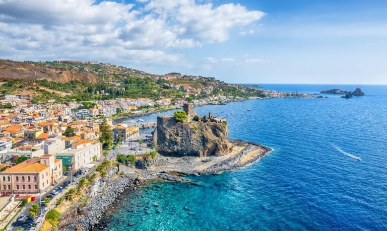 Aci Castello è un affascinante borgo marinaro adagiato sulla costa orientale della Sicilia, a pochi chilometri da Catania, che incanta per il suo perfetto equilibrio tra natura, storia, architettura e tradizione. Il suo nome è indissolubilmente legato all’imponente Castello Normanno, una fortezza costruita nel 1076 dai Normanni su una rupe di pietra lavica a picco sul Mar Ionio. Vista dal mare, la sagoma scura del castello sembra una nave pietrificata incagliata tra le onde e il cielo, sospesa tra mito e realtà. È proprio attorno a questa fortificazione che nel Medioevo nacque e si sviluppò il borgo.