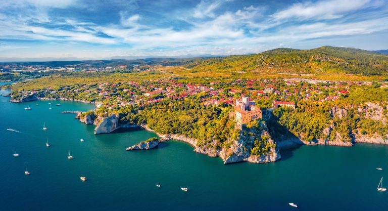 The ancient seaside village of Duino/Devin (Duìn in Trieste dialect, Devin in Slovenian and Tybein in German) is situated between the southern slope of Mount Ermada/Grmada (323 m.) and the white cliffs plunging into the Adriatic.