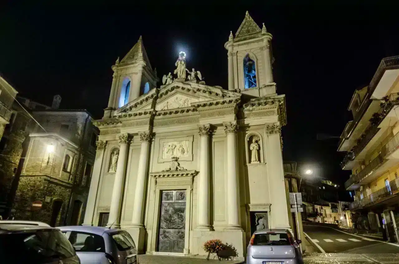 The present structure of the church, rebuilt after the devastating 1783 earthquake, features an imposing Latin cross plan and has three naves, of which the central one is particularly majestic. The interior is adorned with fine stucco work that lends an atmosphere of great beauty and spirituality. The light filtering through the stained glass windows creates plays of shadows and colors, making the environment even more atmospheric.