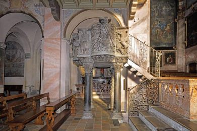The Basilica of San Giulio is one hundredth and last church founded by San Giulio, originating in the island of Aegina in Greece, who with his brother Giuliano devoted the last years of his life to the evangelization of the Lake of Orta. According to the legend, around 390 the holy reached the island sailing on its skirt and the liberated from dragons (symbolic image of the defeat of paganism) building a small church dedicated to the twelve apostles.