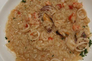 First courses include homemade orecchiette with prawns and seasonal vegetables, linguine with scampi or canoce, and risotto alla marinara.